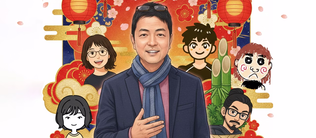 プロンプト:2026年、新年のご挨拶メインビジュアル画像が欲しいです。社長の顔(写真添付morimoto_prof.jpg)はこんな感じで、背景は日本のお正月っぽくして!他の添付イラスト画像(グループ1.png)は会社のスタッフの似顔絵なのでまわりににぎやかしで居て欲しい。