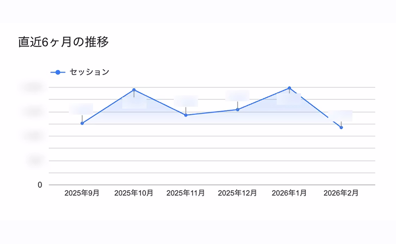 直近6ヶ月の推移グラフや前年比の比較を用いて 、サイト全体の成長状態を確認。デバイス比率や新規・リピーターの割合の変化など、中長期スパンでサイトの健康状態を振り返るための「定点観測」として運用。