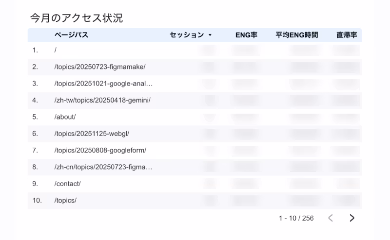 ページパスごとのエンゲージメント時間など、自分たちが見たい項目だけを抽出したリストも作成しています。